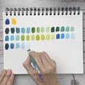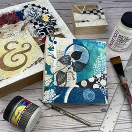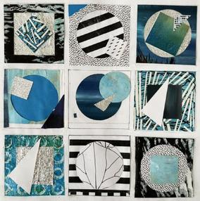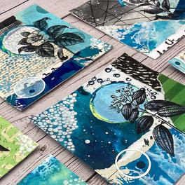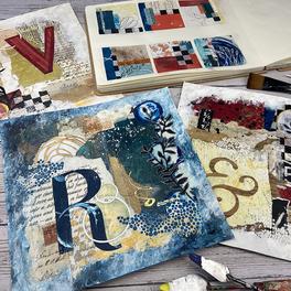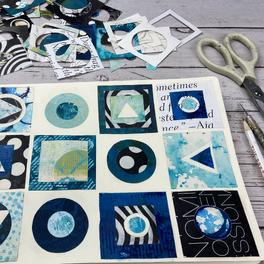 Building on what you learned making the neutral collages, you'll add cool colors to your palette. You’ll begin by creating a collection of cool colored collage papers in different values, and then create two collage grids to see which color combinations speak to you. You'll then use this information to create four or more 6" x 6" collages, adding an image transfer and a shape to finish your mini-series.